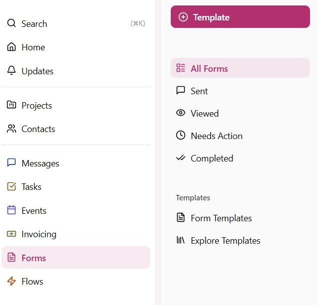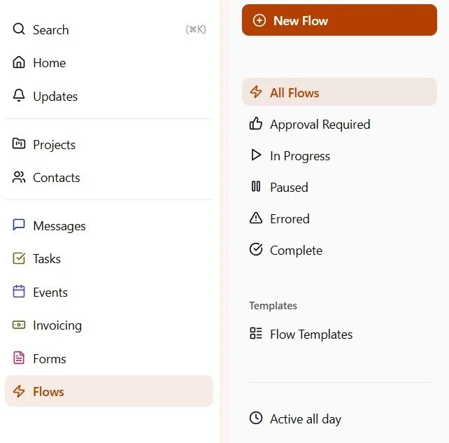 Navigation is now grouped by work area, such as Messages, Tasks, Events, Invoicing, Forms, and Flows. It may take a little time to get used to, but once you do, it starts to feel logical and efficient. The goal is to make it easier to move around without endless clicking.