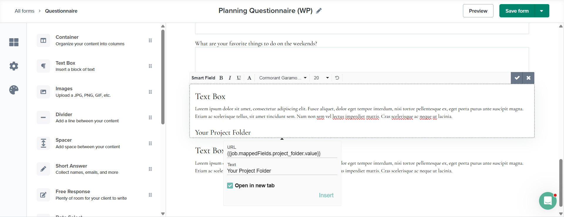 Check ‘Open in new tab’.💡Tip: This helps prevent clients from losing progress if they are completing a questionnaire.