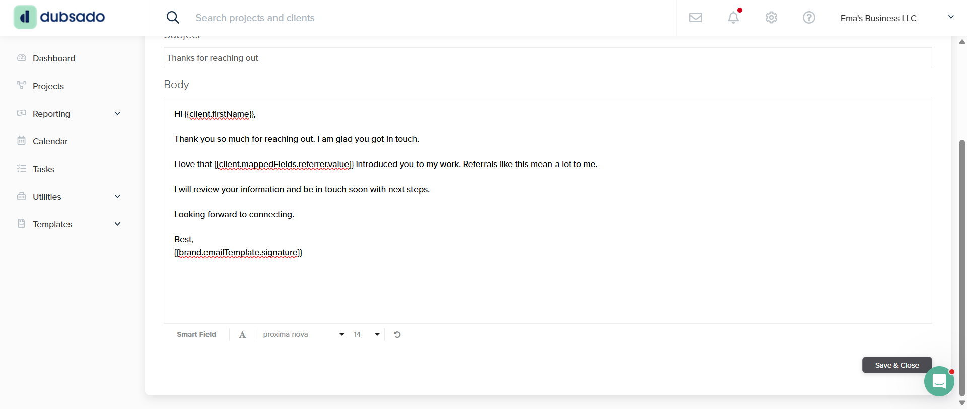For example: If you have a client mapped field titled “Referrer” (the name of the person who referred the client), you would reference {{client.mappedFields.referrer.value}} inside the email so the referrer’s name appears automatically.