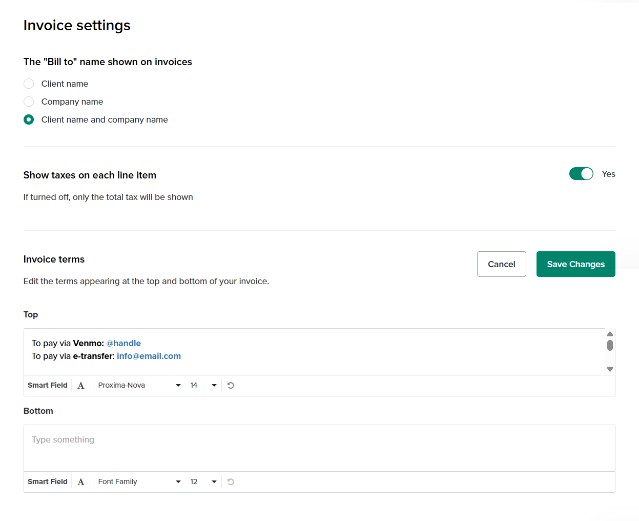 Yes. Under invoice settings, you can add custom terms to the top or bottom of every invoice. Many business owners use this to include e-transfer details, Venmo handles, tax IDs, refund policies, or late fee policies.